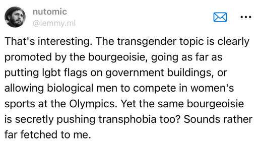 I’m deliberately choosing not to make this about my own views on anarchy vs fake authoritarian socialism, because I want to find common ground with the Lemmy development team in terms of agreeing that transphobia has no place in any version of leftism and no place on Lemmy