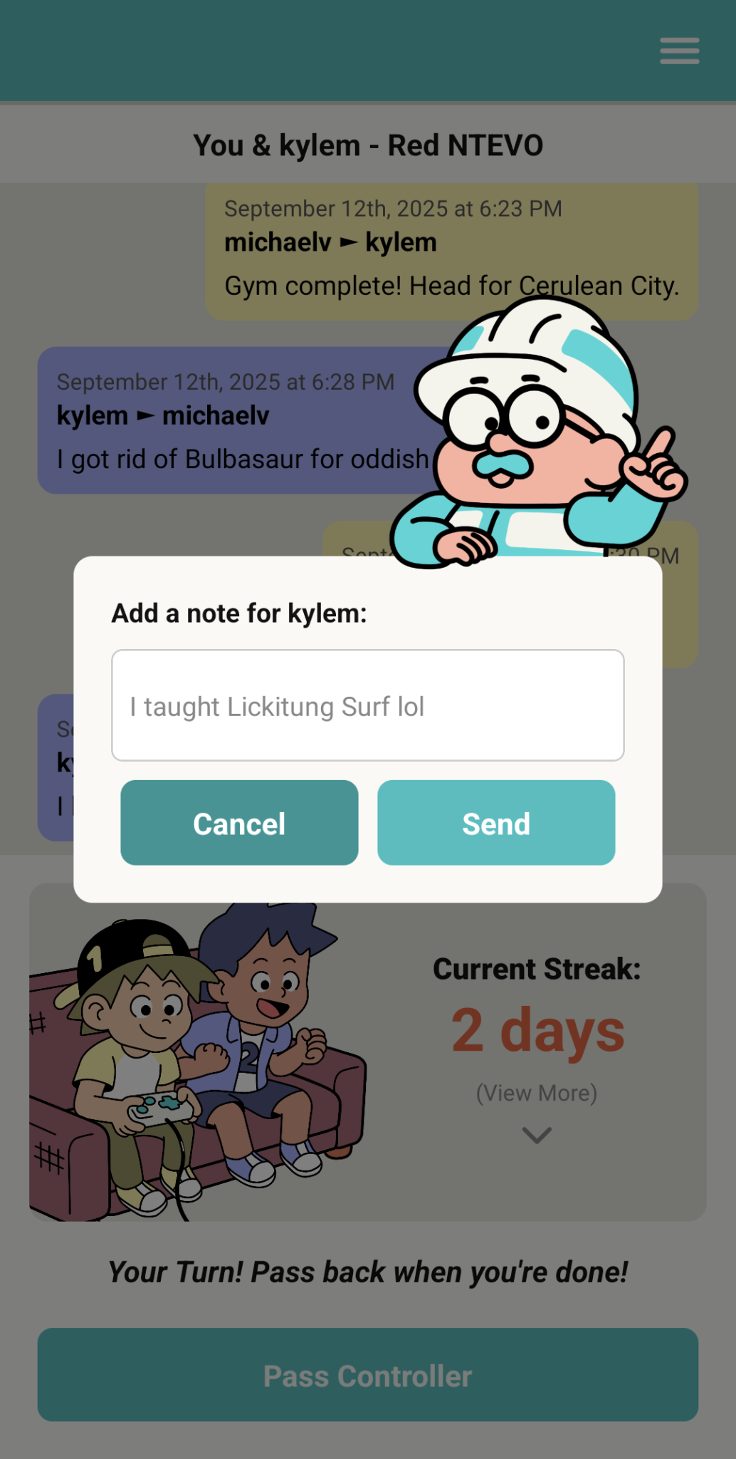 How it works: you and your friend load the same ROM on the same emulator on your devices (currently supported emulators for BETA: John GBA or John GBC - lite or otherwise). Open the Your Turn! app and invite your friend to start a game. Take your turn, save the game using the emulator’s save state, add a note, and upload it in the app. Your friend gets a notification, reads your note, downloads your save, and plays their turn. Repeat back and forth - just like passing the controller!