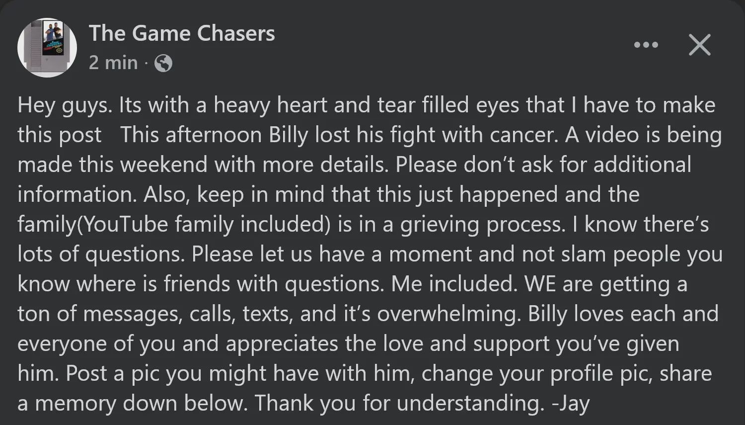 Billy from the retro gaming YouTube channel The Game Chasers has passed away