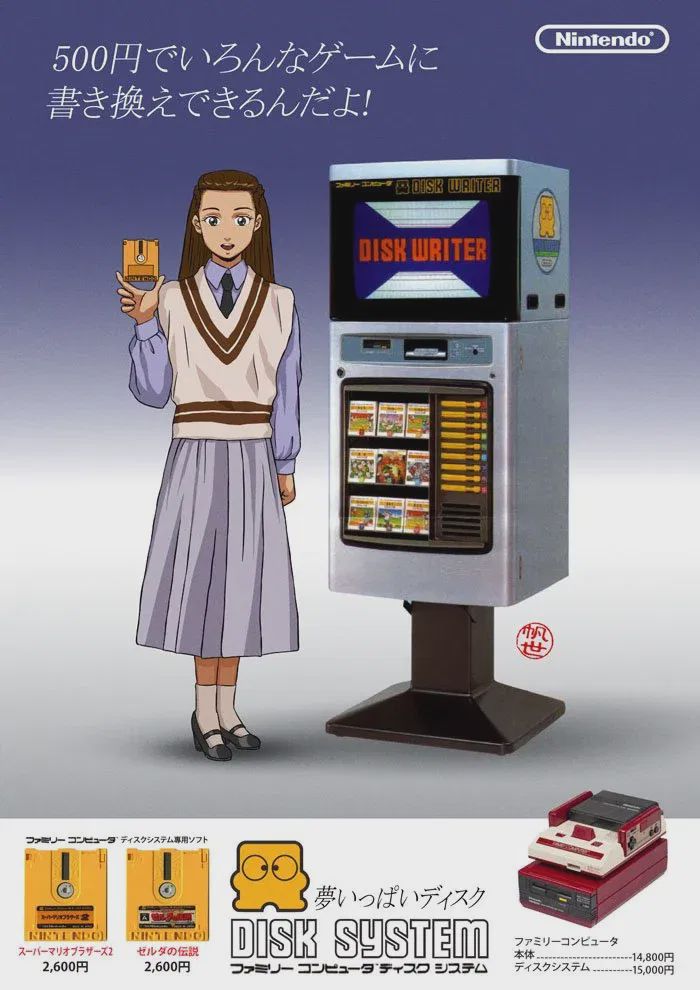 Coinciding with the Disk System’s release, Nintendo installed several “Disk Writer” kiosks in various toy and electronic stores across the country. These kiosks allowed customers to bring in their disk games and have a new game rewritten onto them for a ¥500 fee; blank disks could also be purchased for ¥2000. Nintendo then decided to make an early form of online gaming; In 1987, they introduced special high-score tournaments for specific Disk System games, where players could submit their scores directly to Nintendo via “Disk Fax” machines found in retail stores. Winners would receive exclusive prizes, including Famicom-branded stationery sets and a gold-colored Punch-Out!! cartridge. Nintendo of America announced plans to release the Disk System for the Famicom’s international counterpart, the Nintendo Entertainment System, and began filing patents simultaneously. However, by the time these were approved in November 1988, Nintendo cancelled their plans to release the system stateside.