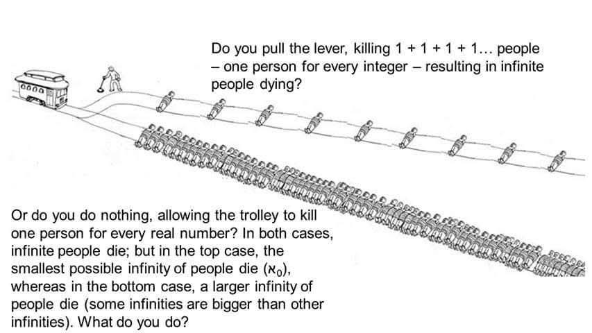 And yet there can never, and will never, be a situation where an infinite number of people are tied to a railroad track. So this thought experiment is meaningless.