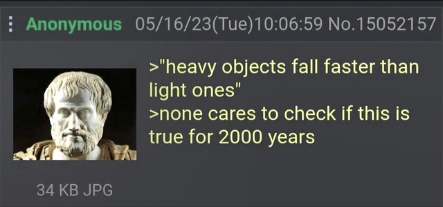 Yeah, it’s not like they just blindly accepted what he said. They held up a feather or a leaf or a sheet of paper and a lead weight and dropped them both at the same time and the lead weight hit the ground while the leaf was still fluttering in the wind.