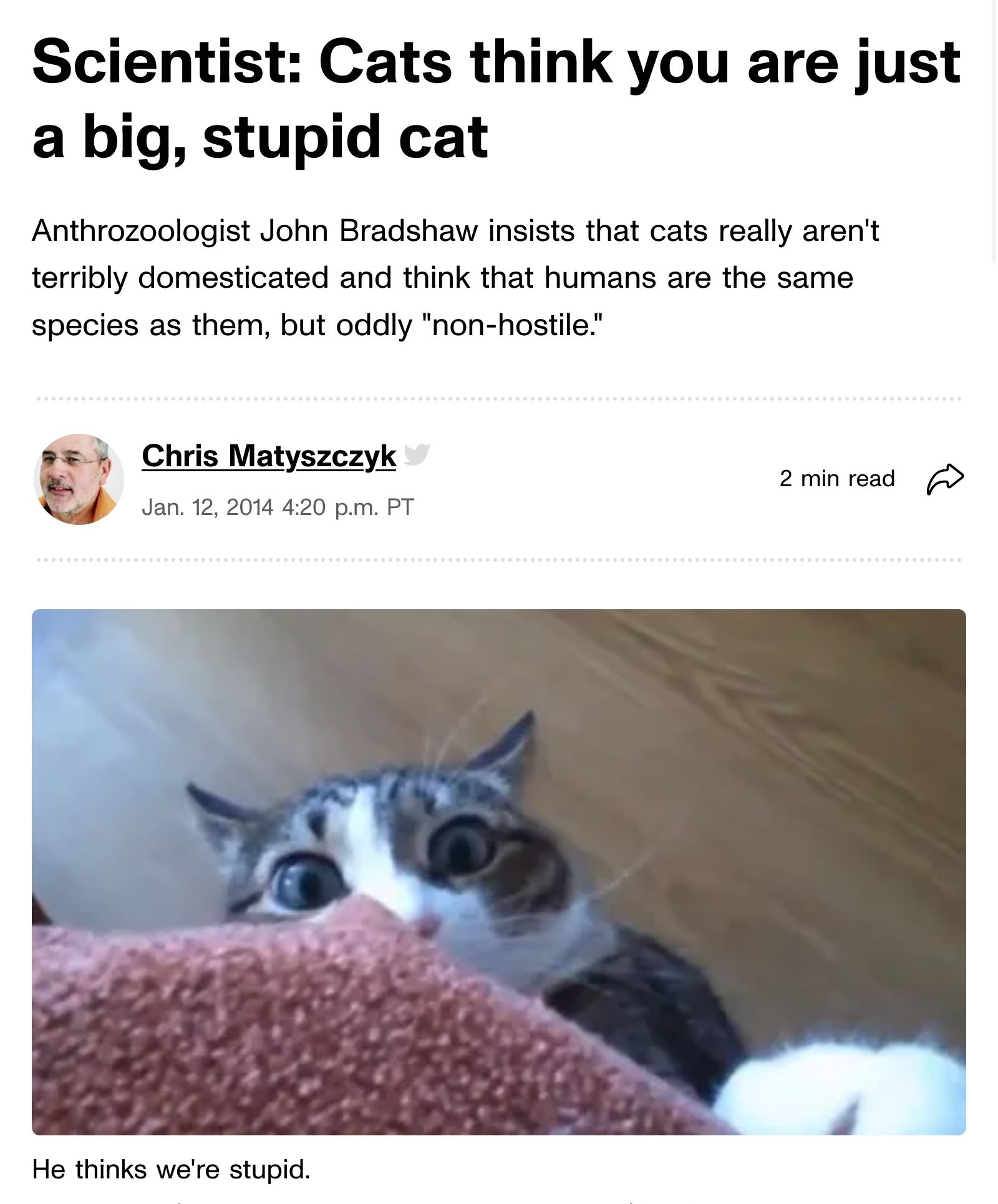 Further, another “fun fact” I see a lot (equally questionable) is that cats meow only to communicate with humans, not cats. But that’s mutually exclusive with cats thinking humans are the same as them.