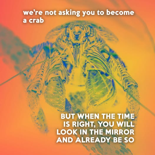 no chitinous exoskeleton… no limb regrowth… only four limbs… conclusion: human trying hardest to be crab, but not succeeding