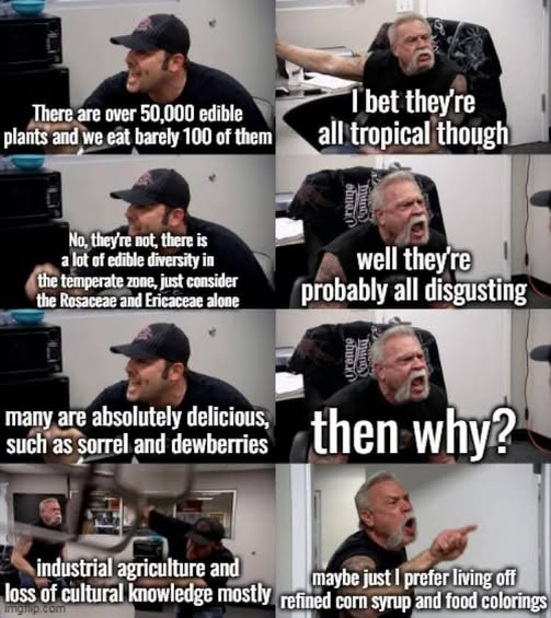 I mean, I think that goes back to the whole “industrial farming” point. If it can’t be farmed, it won’t be commercially available. But there are plenty of plants that you could scavenge, if you knew what to look for.