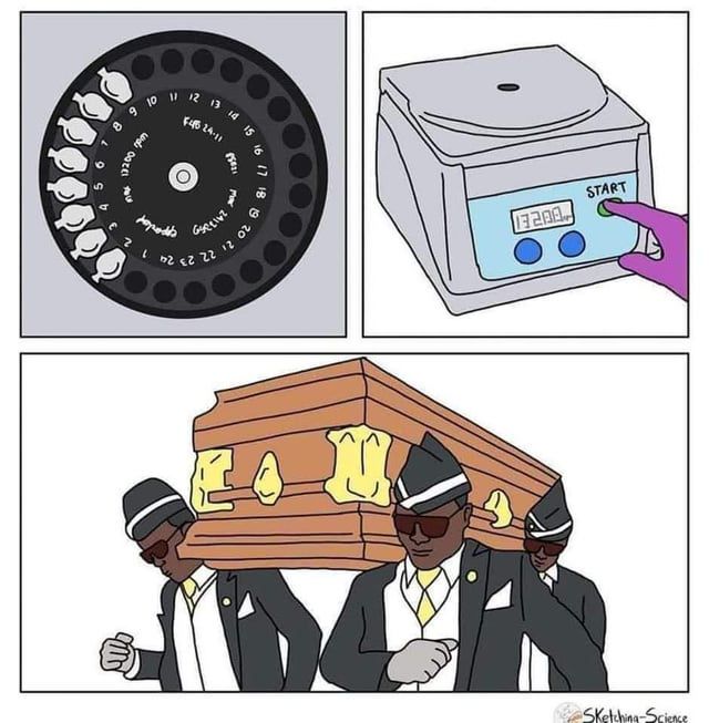 Or, more accurately, I’m more familiar with the small ones (ThermoFisher calls them “Mini” and “Micro” centrifuges) for ~0.5mL samples and I had a hard time thinking that those would blow out a room. But the same link (ThermFisher) that I looked at to find the names also specifies 17,000g and 21,000g models which is just… fucking insane. I knew they spun fast, I didn’t know they spun 21,000g’s fast. Learn something new every day.