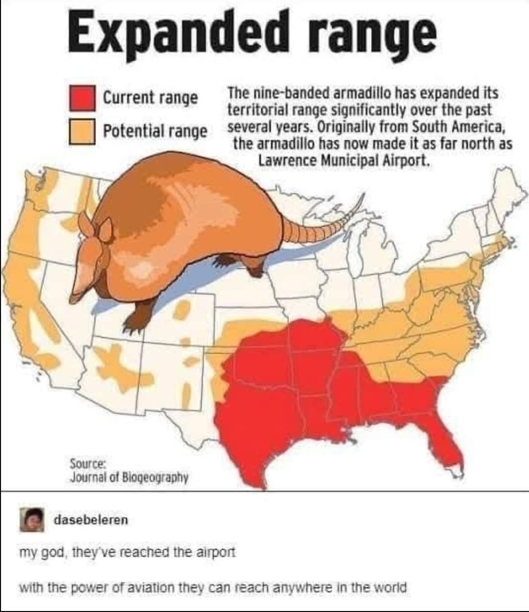 Yo I love armadillos and I rarely see them, but this map shows them just barely where I live. I hope to see one here soon, I’m sure the first one I see will be on the road, but then hopefully alive soon too :)
