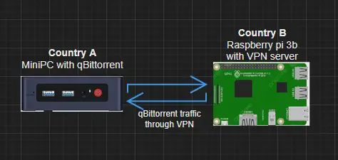 I currenly reside in a country with strict piracy rules but also have access to the internet in a country where piracy is not enforced. I want to setup a VPN and route qBittorrent’s traffic through it. The idea is to do something like this:
