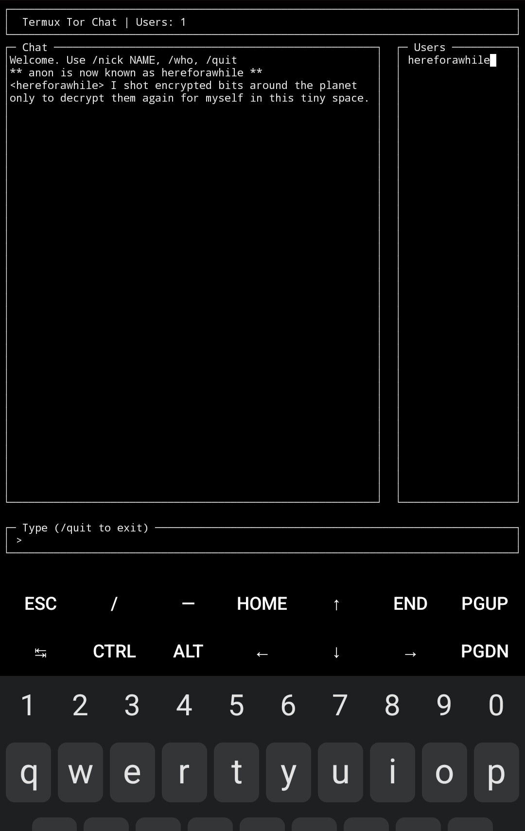 Using Termux to create a tiny selfhosted hidden chat server with E2EE.