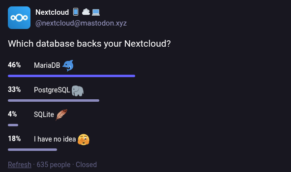 The poll did not ask specifically for self-hosted instances. You know you can buy hosted Nextclouds where the service provider hopefully cares for that stuff? So customers wouldn’t know which database they use. I don’t know which database my mail provider uses ¯\_(ツ)_/¯
