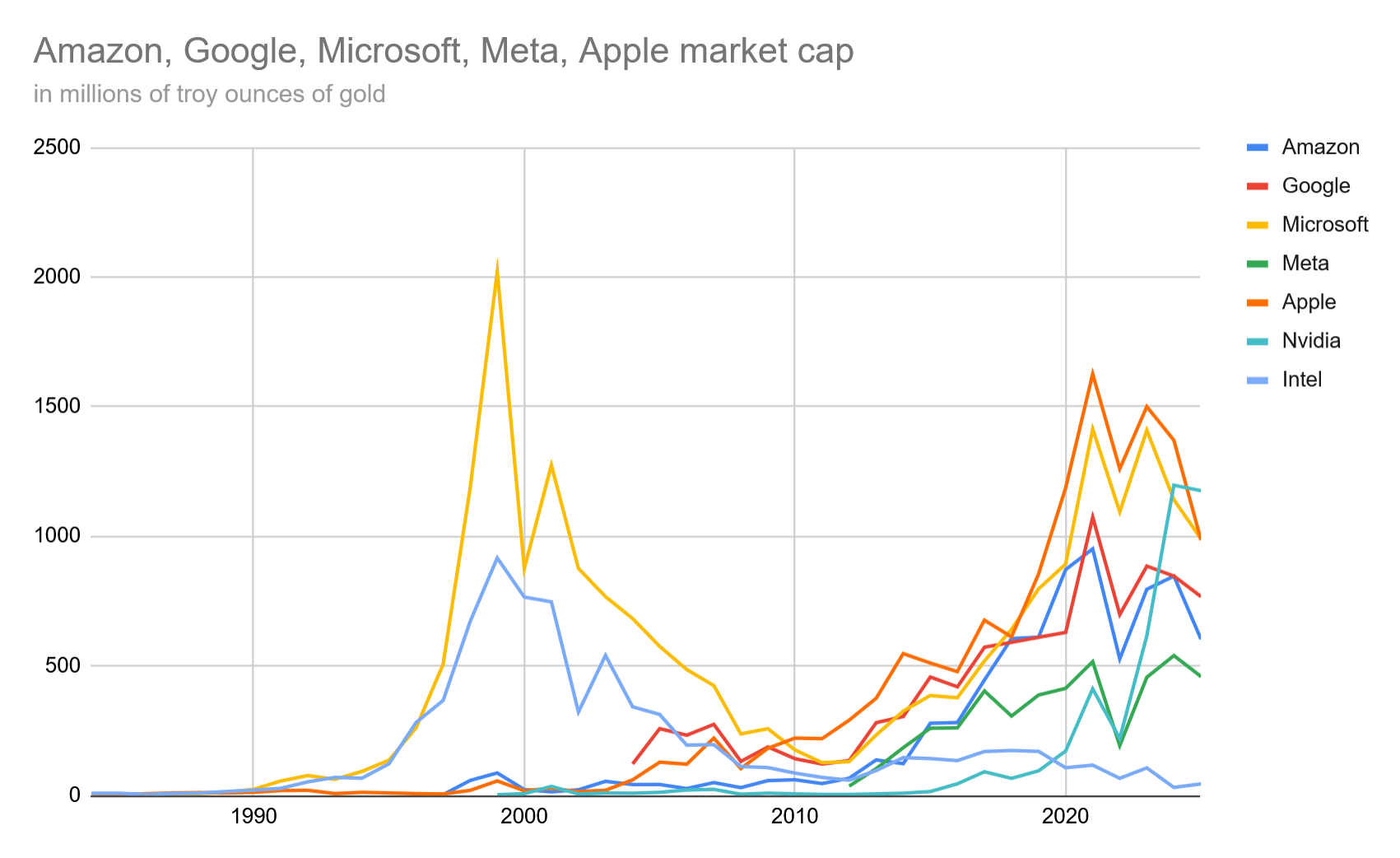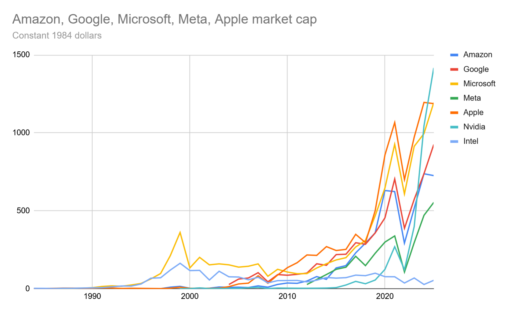 1984 was chosen as the baseline because that was the year Apple started trading publicly, with most of the other companies IPOing thereafter. I only went back and added Intel (hence it being missing from the chart titles) because it happened to start trading the same year, and I already had the formulas. What a shitshow that’s been.
