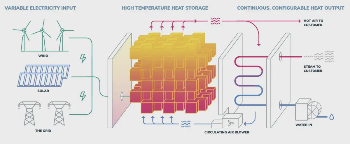 This seems like a stupid idea at first but it’s actually amazing. They mix high resistance metals into the bricks so the bricks can conduct electricity and heat up while doing that. And then they blow air through the holes on the bricks to extract the heat whem needed. It leaks about 3% of the stored energy per day which is absolutely nothing considering it’s cost